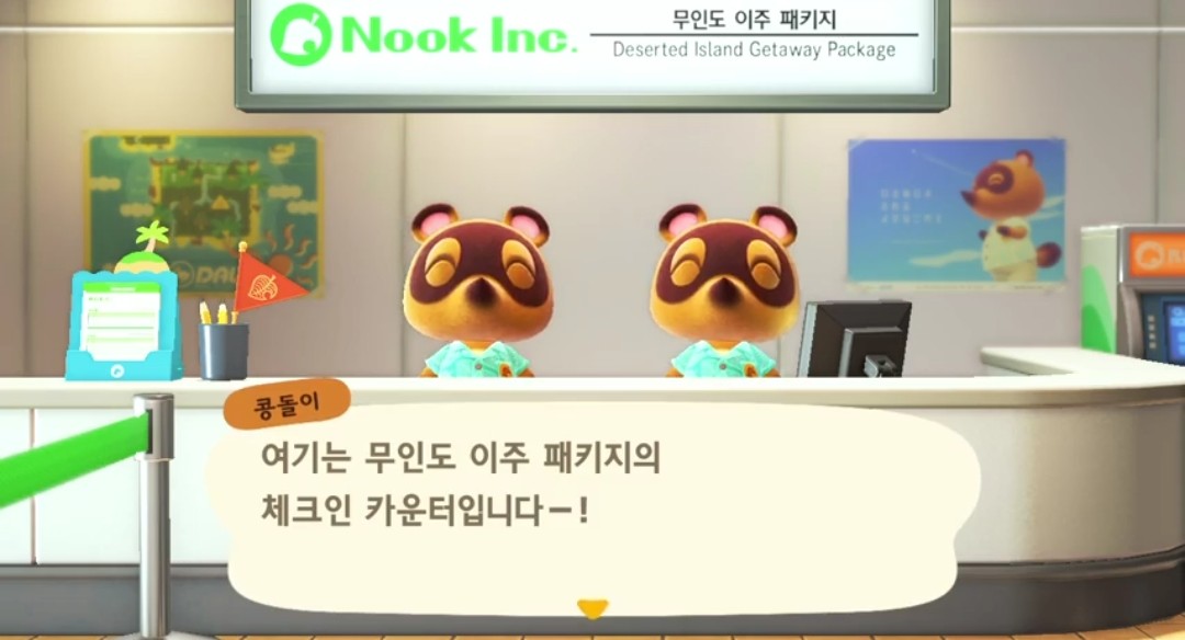 처음 시작하면 무인도 이주 패키지의 체크인 카운터에서 콩돌이와 밤톨이가 반갑게 우리를 맞이해 줍니다. 여기에서 대표 주민 이름, 생일 및 성별 입력을 진행합니다.