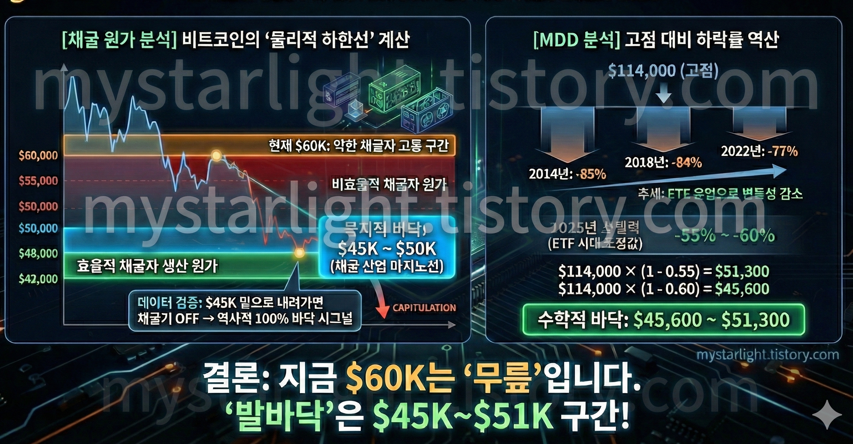 다음 내용은 참고만 하시기 바라며 투자에 대한 어떤 책임도 없음을 밝힙니다.최근 비트코인이 60K 구간을 횡보하면서 많은 투자자분들이 "지금이 바닥일까?" 고민하고 계실 텐데요. 시장의 감정이나 뇌피셜이 아닌, 철저한 수학적 데이터와 산업 구조를 바탕으로 현재 비트코인의 위치를 분석해 보았습니다.결론부터 말씀드리면, 지금의 60K는 '무릎'에 불과합니다. 진짜 '발바닥'은 어디인지, 두 가지 핵심 데이터를 통해 증명해 드리겠습니다.1. [채굴 원가 분석] 비트코인의 '물리적 하한선'비트코인 가격은 장기적으로 채굴 원가(Production Cost) 밑으로 오래 머물 수 없습니다. 가격이 원가 이하로 떨어지면 채굴자들이 손해를 보며 파산(Capitulation)하게 되고, 이는 곧 공급 감소로 이어..
